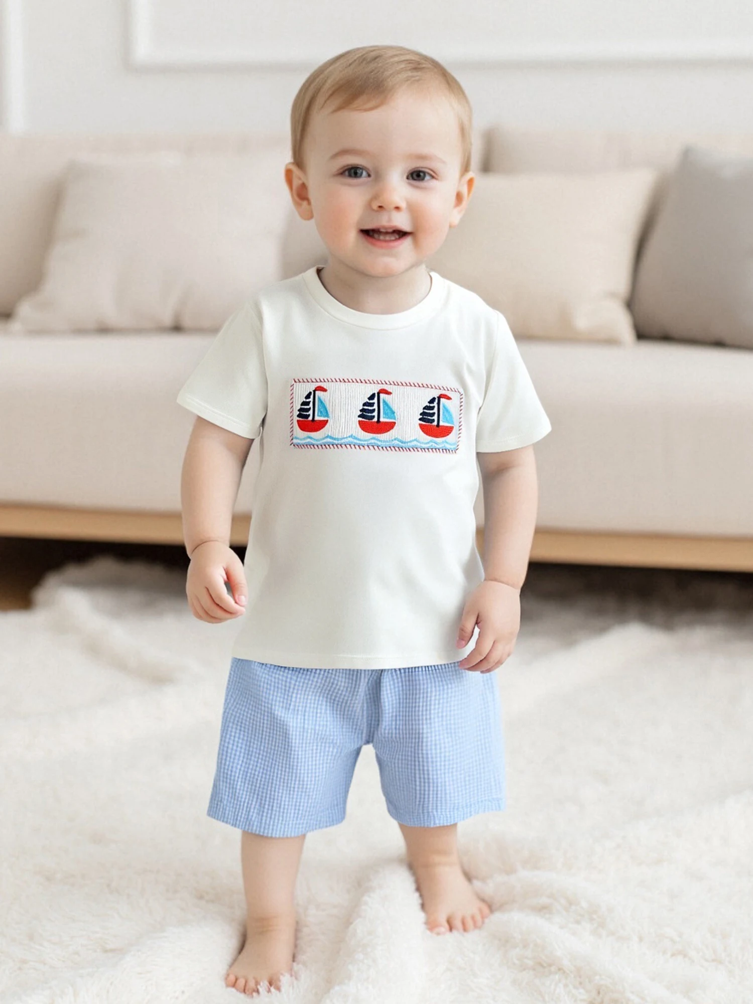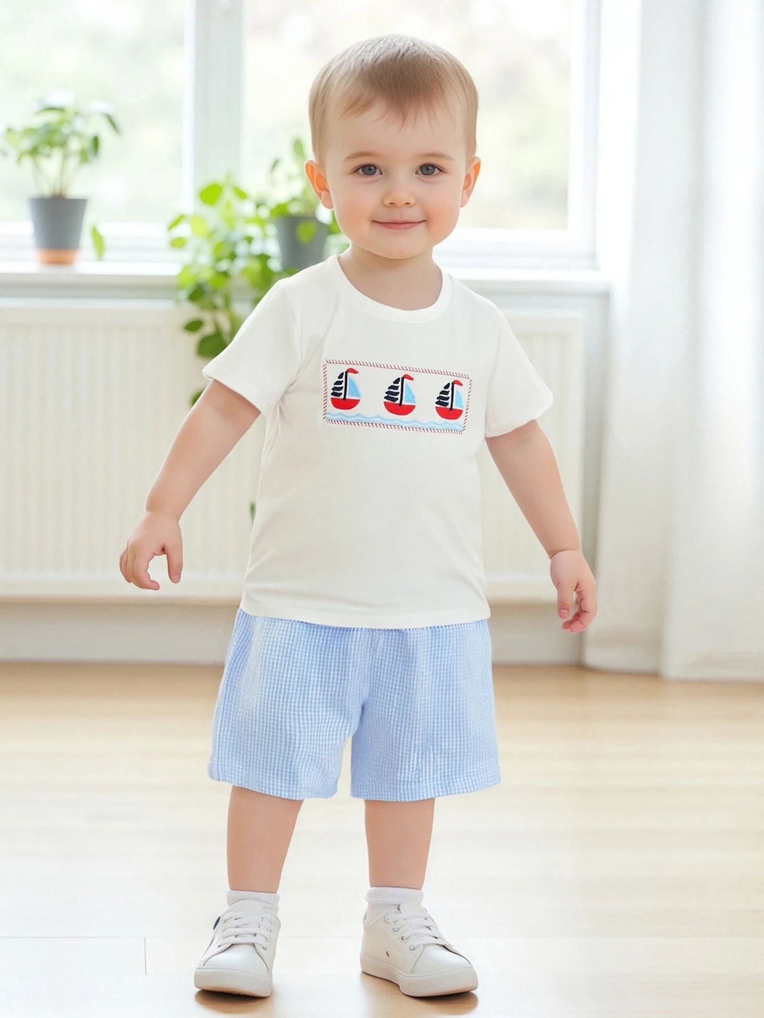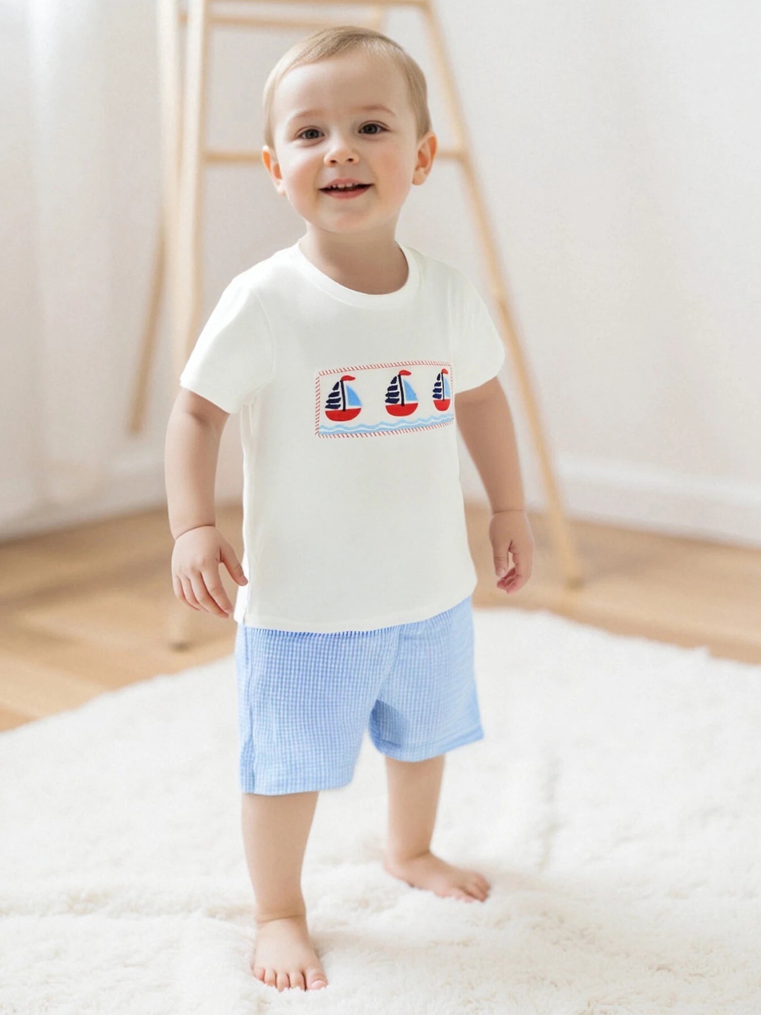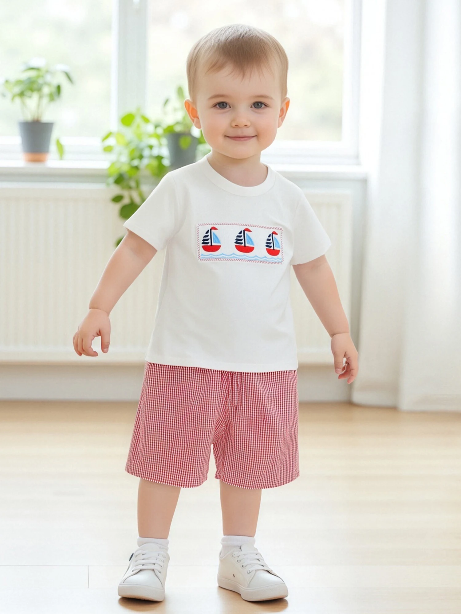 Cute baby boy clothes; Baby boy t-shirt with boat embroidery, round neckline and short sleeves; Baby boy shorts with plaid print and elastic waist to ensure comfort and fit