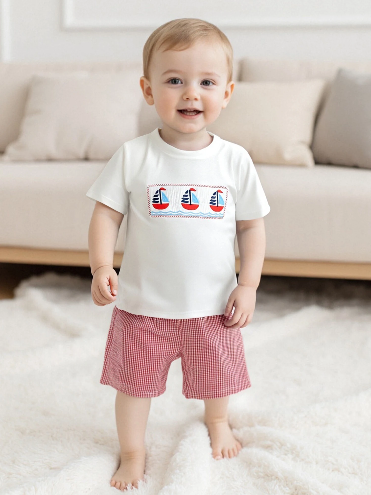 Adorable Baby Boys Nautical Theme Outfit with Boat Embroidery Short Sleeves T-Shirt and Plaid Shorts - 2 Piece Summer