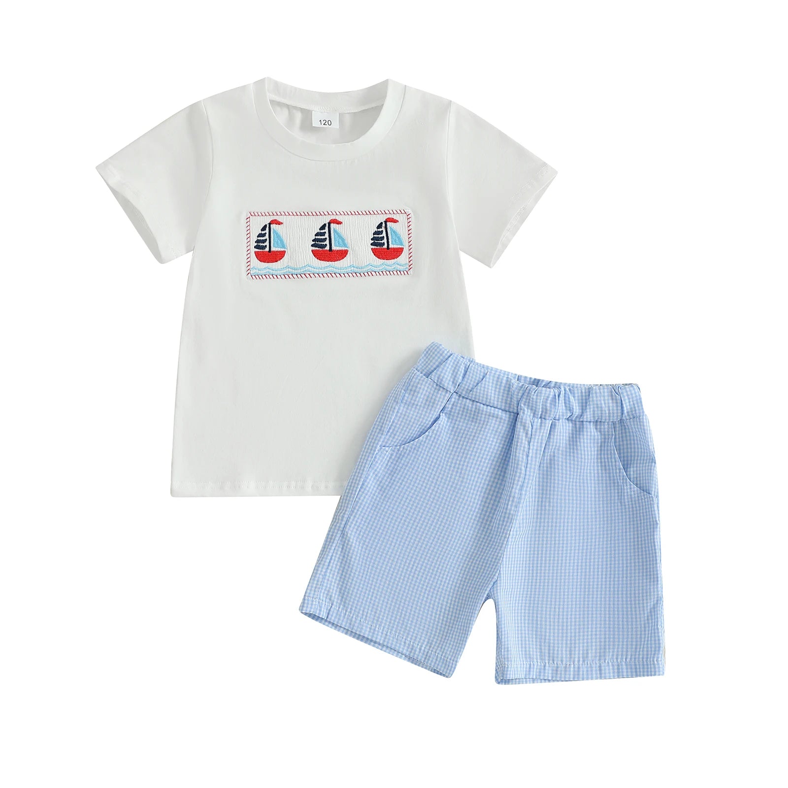 Baby Boys Summer Outfits Boat Embroidery Short Sleeves T-Shirt and Elastic Plaid Shorts Set for 2 Piece Clothes SetFeatures