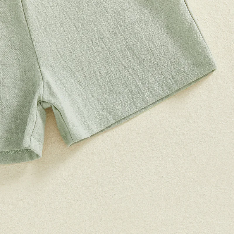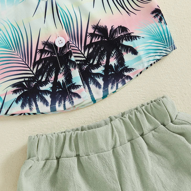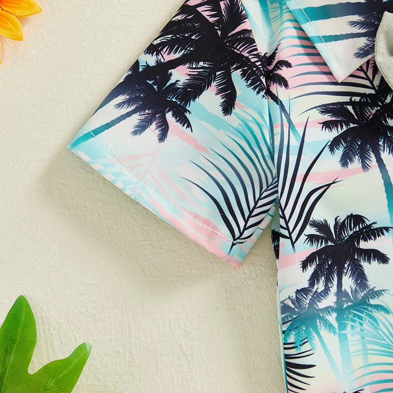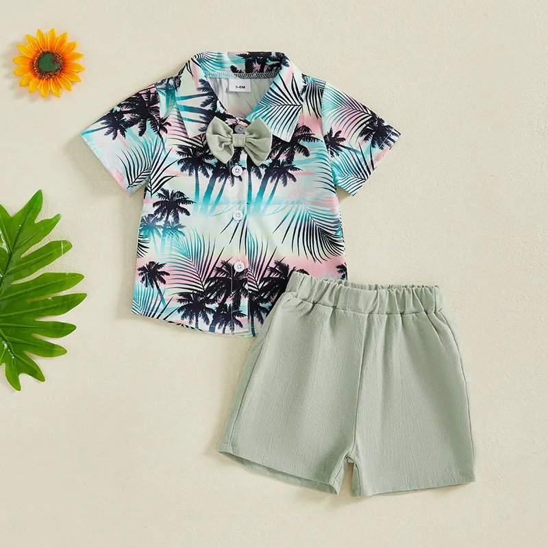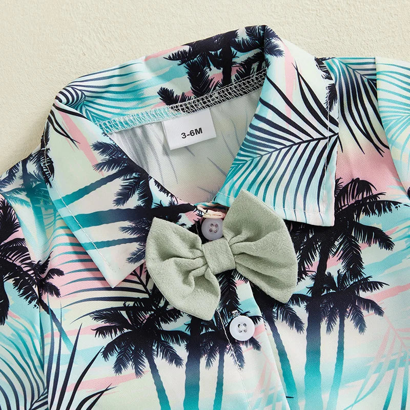 Baby boy shirt with tropical print, short sleeves, bow tie, front button closure and lapel collar; Toddler shorts, elastic waist design ensures a comfortable fit, perfect for daily wear